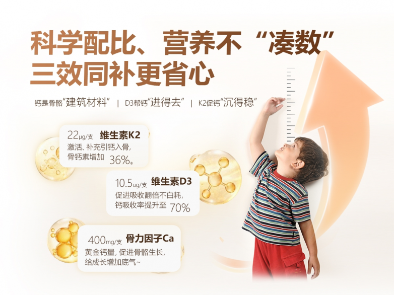 儿童成长黄金期是骨骼发育的关键阶段,钙质作为构成骨骼与牙齿的核心物质,不仅是支撑孩子身高增长、骨骼强健的基础营养素,更深度参与身体代谢、神经传导等多项重要生命活动,是孩子健康成长不可或缺的营养支撑。可很多家长在育儿过程中,总会遇到这样的困扰:孩子挑食偏食、不爱喝牛奶,钙质摄入远远不足;补了不少钙,可孩子还是盗汗、生长迟缓,甚至出现肢体抽搐的小状况;走路没多久就喊腿酸,乳牙萌出迟缓,比同龄人长得慢。很多家长把这些当成“孩子成长必经的小问题”,觉得再大一点就好了,却不知道这不是成长的必然,而是钙质补充不足、吸收不佳,发出的成长预警,长期忽视可能影响骨骼发育,甚至导致佝偻病、成年后身材矮小等问题。
