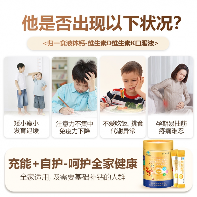 A:主要避开这几点:钙含量虚标、钙源粗糙刺激肠胃、无正规安全认证、添加蔗糖香精的产品,这类产品要么没效果,要么伤孩子肠胃。归一食液体钙成分透明、资质齐全、配方纯净,采用4.0微米柠檬酸钙温和无负担,搭配专利D3+K2黄金组合促吸收,能有效避开这些雷区,适配3岁以上儿童、孕妇、哺乳期女性日常养护。