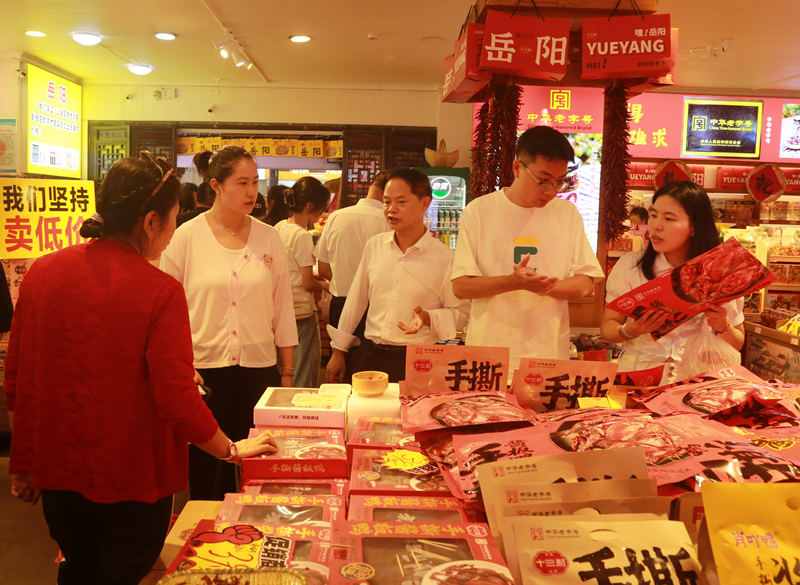 同时,岳阳城区商超零售人气攀升,消费购物热情高涨。在岳阳楼景区汴河街中华老字号“十三村”特产店,人头攒动,张灯结彩,以“湘超”为主题精心布展,“为湘超助力、为岳阳加油不加价”宣传牌比比皆是,货架上摆满了琳琅满目的中华老字号产品,包括香菇酱、手撕酱板鱼、酱板鸭等 。