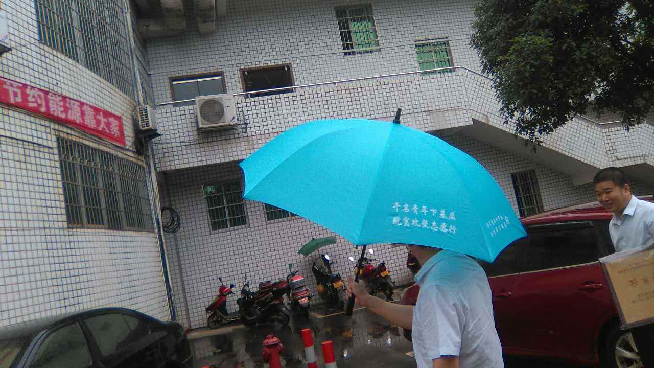 团委领导愉快地撑开雨伞:湖南省安全教育中心真心为贫困户出力,不仅募集《安全知识教肓读本》配送贫困户,让安全知识进村入户,而且还亲力亲为,把公益用伞及时送到,善举感人。扶贫攻坚,莫过于雨中送伞呀!