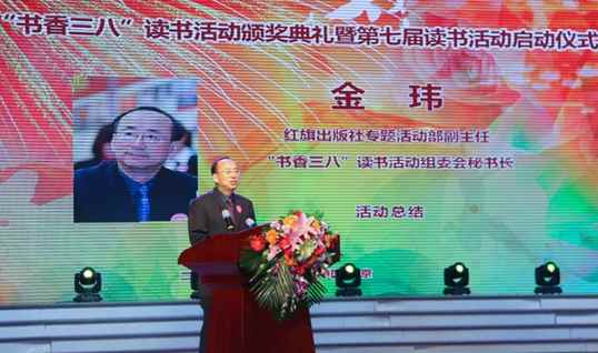 红旗出版社专题活动部副主任、“书香三八”读书活动组委会秘书长金玮向大会作了第六届“书香三八”读书活动汇报,并宣布获奖名单。