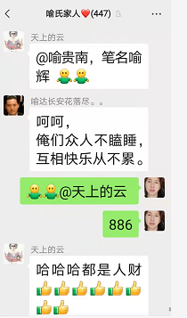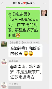 群里有点赞的,有聊及天上的云所在的工厂,也有聊到疫情,宗亲喻志勇说,他去做核酸检测了,他说今年就是在疫情中度过的!