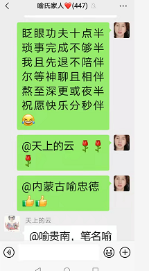 我唱道: “你在线上,群里就热闹,你不在线上,哪里哪里都不热闹,不止你,不止我,不止你我,还有大家。没有你,没有我,群里还有大家、大家不出来,一点都不热闹”