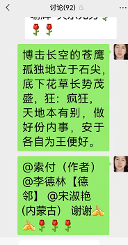 群内于敏发了一张图,一只老鹰孤独地立于石上,石头下面草正浓、花正开,给人很强烈的感觉就是彼此的世界虽无法企及,但能和平共处,且自成风景。我想鹰有鹰的追求,草有草的乐趣,正如人,能力有大小,能发自己的光就好。