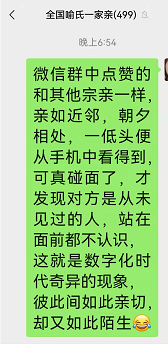 诗意:微信群中点赞的和其他宗亲一样,亲如近邻,朝夕相处,一低头便从手机中看得到,可真碰面了,才发现对方是从未见过的人,站在面前,都不认识 ,这就是数字化时奇异的现象,彼此间如此亲切却又如此陌生。