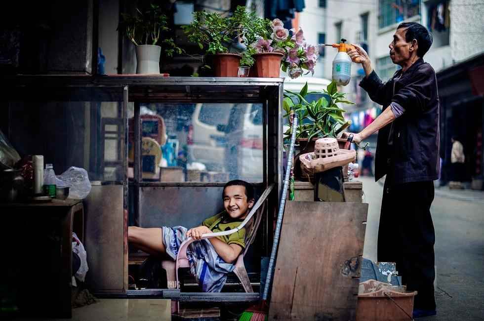 宋桃是个脑瘫患者,从小不能走路,由于家里地方不够住,一开始家里人白天把他放在外面,晚上再抱回兼做店铺的外屋,但几年前她母亲抱不动他时,他就开始了独自的“柜中”生活。玻璃柜是宋桃“升级”过的新家,此前的几年,他住在黑乎乎的塑料布棚子里,再往前是一张椅子加一把遮阳伞。