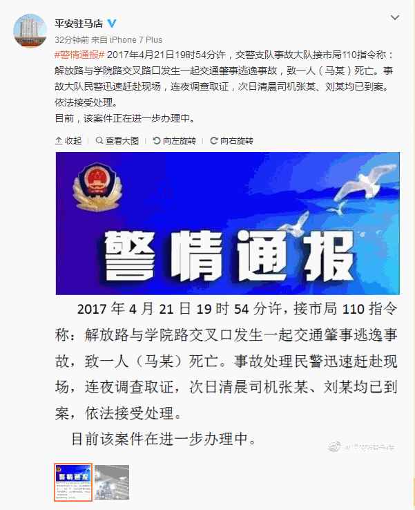 2017年4月21日19时54分许,交警支队事故大队接市局110指令称:解放路与学院路交叉路口发生一起交通肇事逃逸事故,致一人(马某)死亡。事故大队民警迅速赶赴现场,连夜调查取证,次日清晨司机张某、刘某均已到案。依法接受处理。