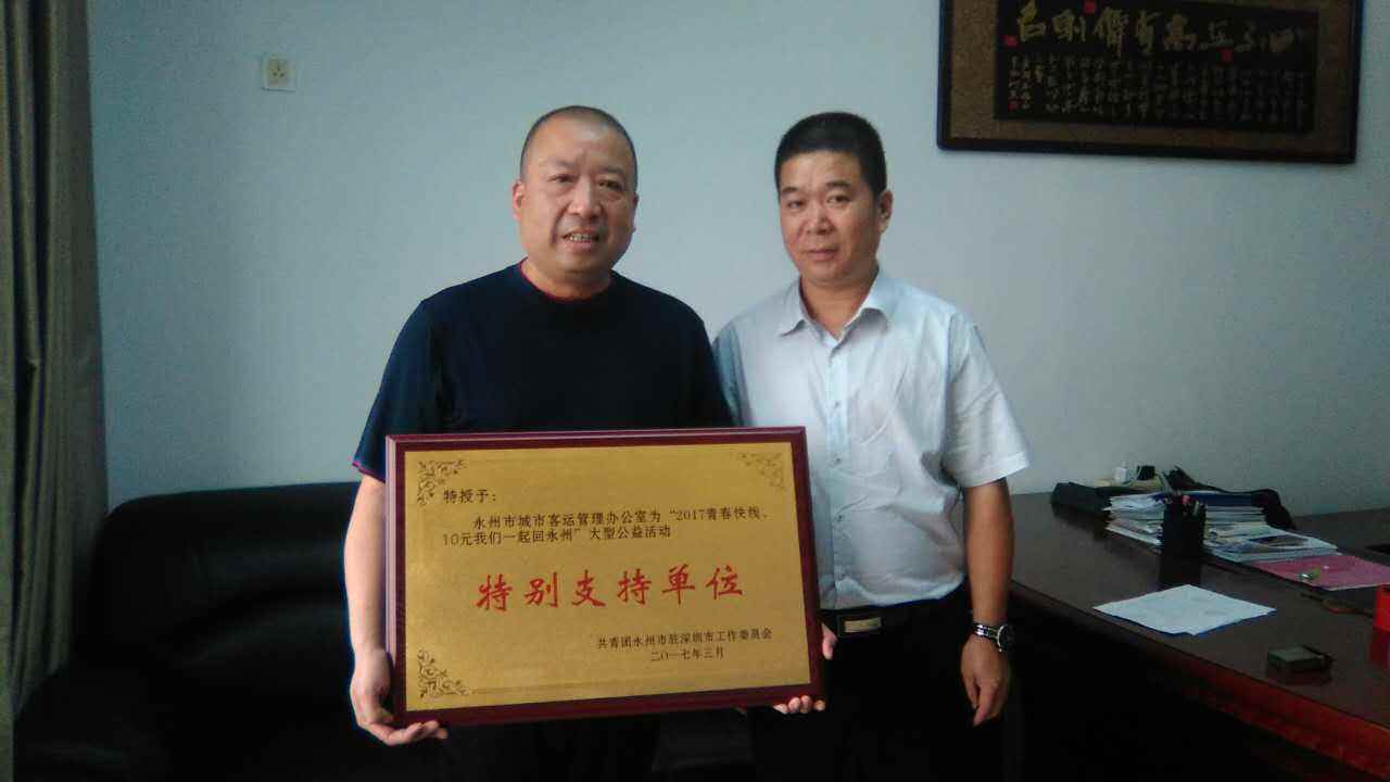 2017年7月4日上午,为了表达对永州市交通运输局、城市客运办、汽车北站、永州义工联合会的感谢,活动组织方永州驻深团工委书记王成,在湖南省安全教育中心领导的陪同下,为他们授予特别支持单位的牌匾,并送上我们诚挚的感谢。单位领导纷纷表示,希望今后青春快线做得更好,我们一定尽力支持。
