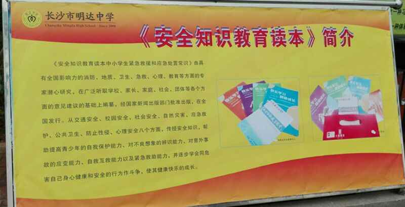 2017年9月13日,湖南省安全教育中心向长沙市明达中学捐赠1000册《安全知识教肓读本——中小学生紧急救援和应急处置常识》,用于启动“美德进课堂-安全伴我行-爱心满校园”大型公益活动。