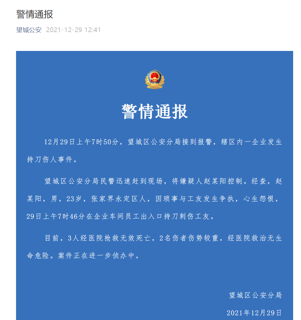 12月29日,湖南长沙望城区发生一起持刀伤人事件,望城区公安分局发布警情通报,全文 如下: