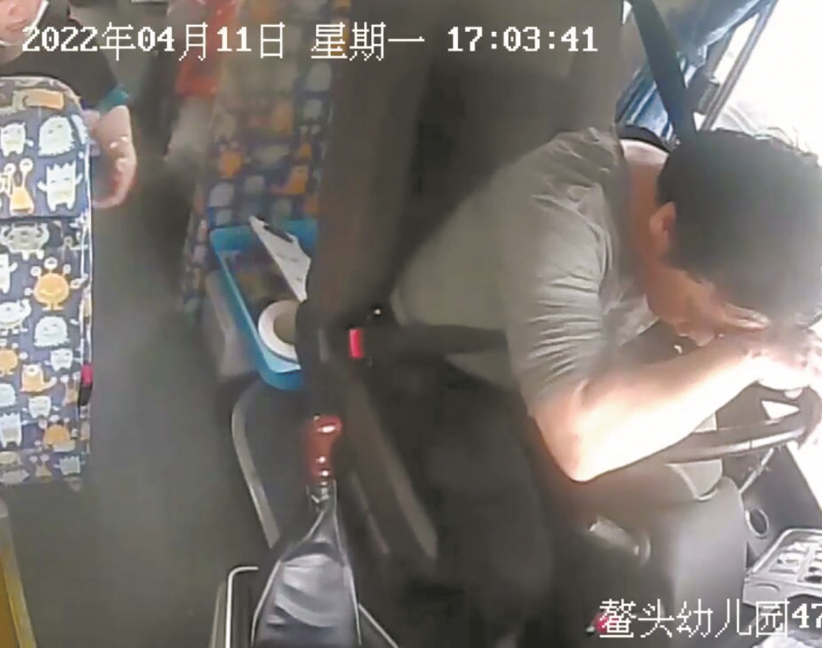 车内视频显示,监控时间4月11日下午5时2分,校车司机在驾驶车辆时明显出现了身体不适的情况。他强忍疼痛,轻踩刹车,将车辆平稳靠边停放好。随后,司机开始呕吐,并时不时趴在方向盘上,还拿起手机拨打电话。车内的一位老师,一边安抚着车内的幼儿,一边也在用手机打电话。