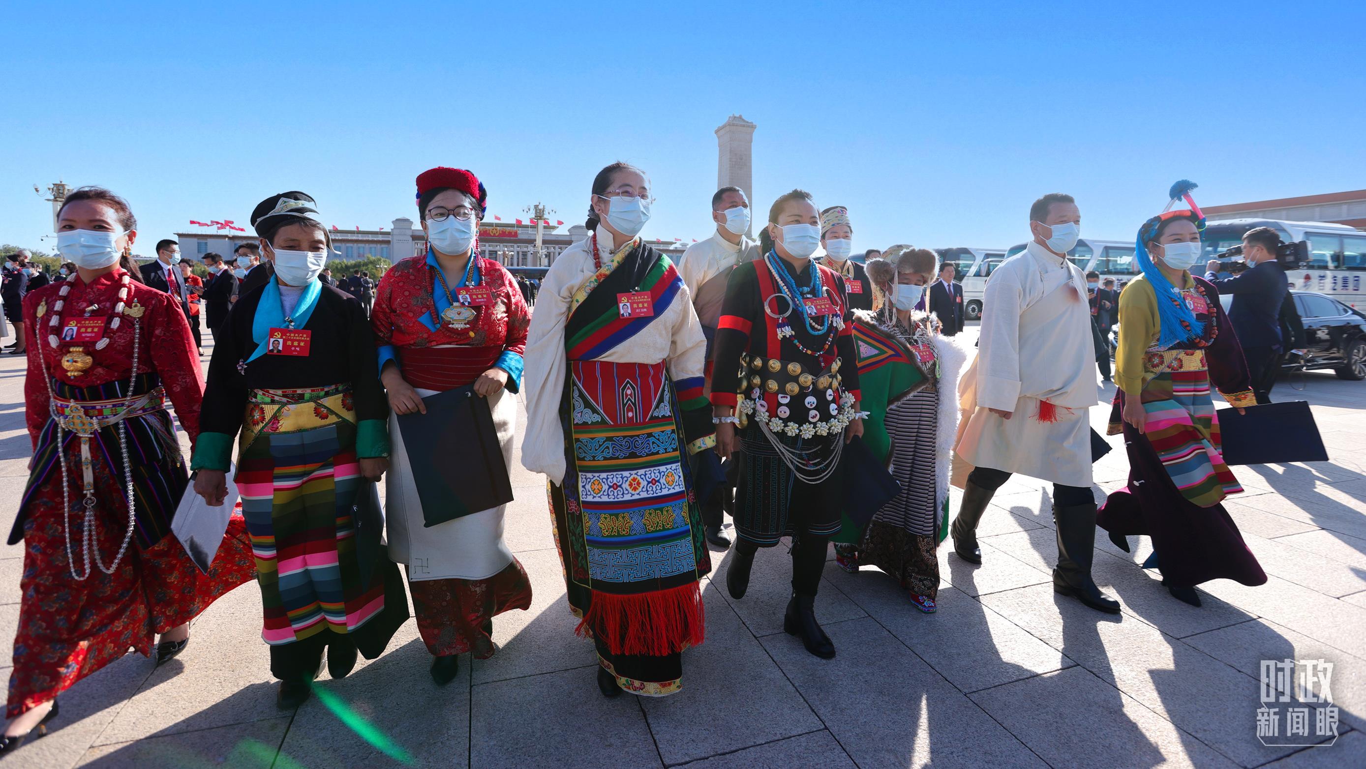 △正在步入会场的西藏代表团代表,左二是卓嘎,去年她获颁“七一勋章”。(总台央视记者魏帮军拍摄)