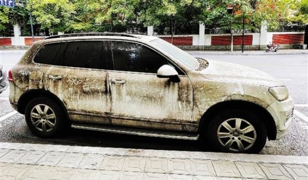 这辆白车大众途锐是“苏J”牌照,厂商指导价目前为53.38-78.28万。车子已经停在竞舟路上靠近文二西路的西侧路边公共泊位内2年多,10月20日8点39分打印出来的停车收费单据显示,这辆车在杭州市区道路泊位停车累计产生49463元未付。车子车身上满是污渍,有点像黑油腻在上面,挡风玻璃、车顶上都是树枝、灰尘,车内比较干净,没有放置多余的物品,座椅等处皮面已开始老化脱落,四个轮胎还都有气。