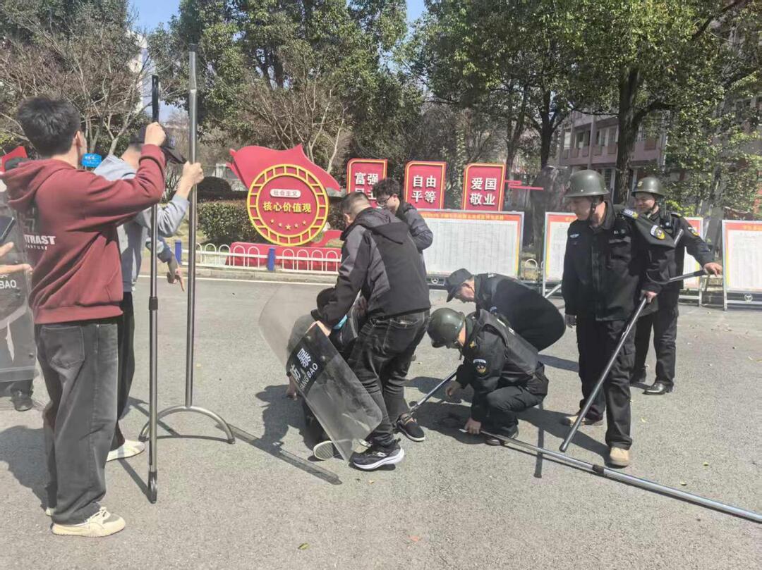 而在“可疑物品应急处置”场景中,巡逻保安对教学楼前无人认领的包裹(模拟爆炸物)迅速反应,立即划定警戒区、疏散周边人员,并第一时间模拟联系专业排爆力量,展现了规范、冷静的应急流程。