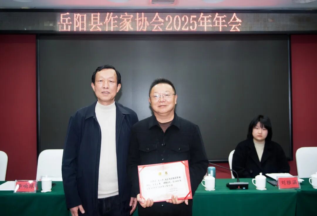会议在庄重热烈的氛围中拉开帷幕,聘任仪式有序举行。县作协主席李响球代表协会为毛一民同志颁发名誉主席聘书,对其长期以来为岳阳县文学事业发展所作出的辛勤付出与突出贡献致以诚挚谢意,并期盼他继续发挥引领作用,为协会建设与文学创作建言献策、赋能助力。