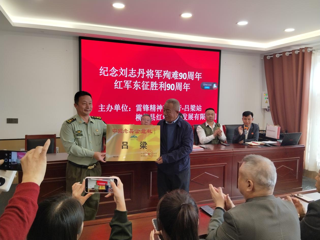 中关村绿色矿山产业联盟陕西代表处秘书长代表中绿盟,为强周元颁发“中国老兵公益林·吕梁”牌匾,充分彰显了中国老兵不忘初心、服务社会、绿色发展、奉献担当的时代风采,也体现了社会各界对老兵公益事业的高度认可与大力支持。