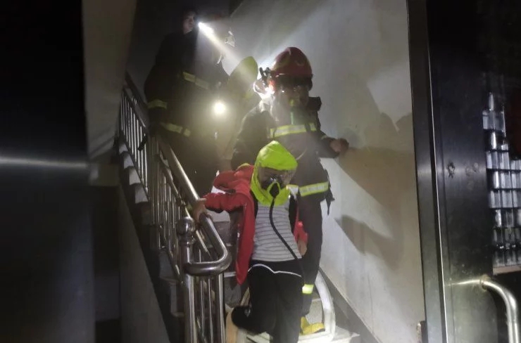 搜救人员为被困母子戴上面罩后,搀扶其撤离火场。救出被困人员后,现场指挥员集中所有力量对火势进行扑救,凌晨4点20火势被成功扑灭。4点28分,指战员在检查现场无复燃迹象后归队。