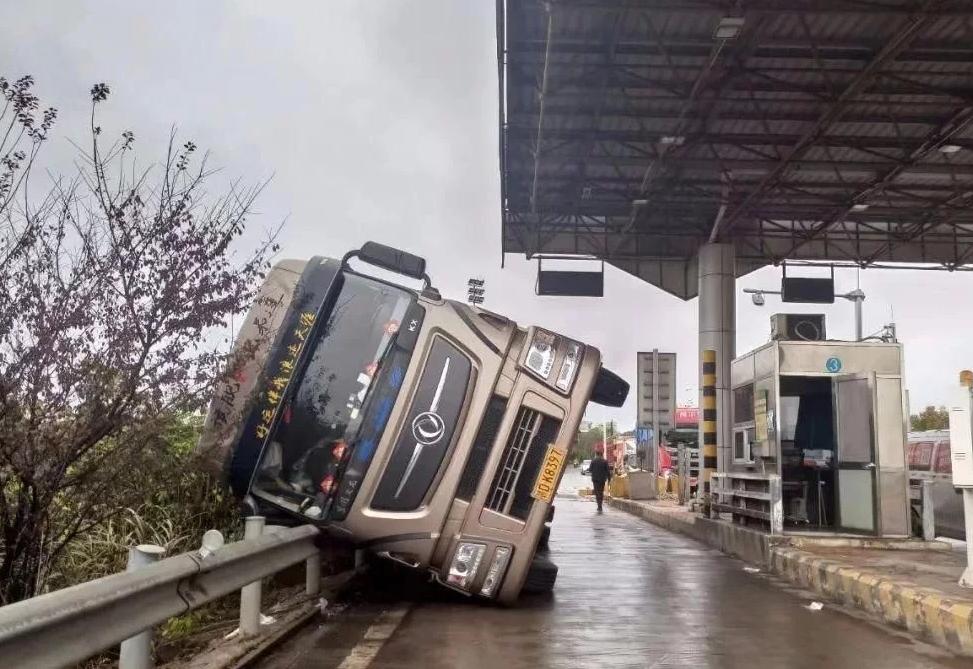 11月4日14时许,S80衡邵高速衡阳段珠晖北收费站入口,一辆半挂车发生侧翻,车上货物倾倒,造成收费站超宽车道无法通行,所幸未造成人员伤亡。