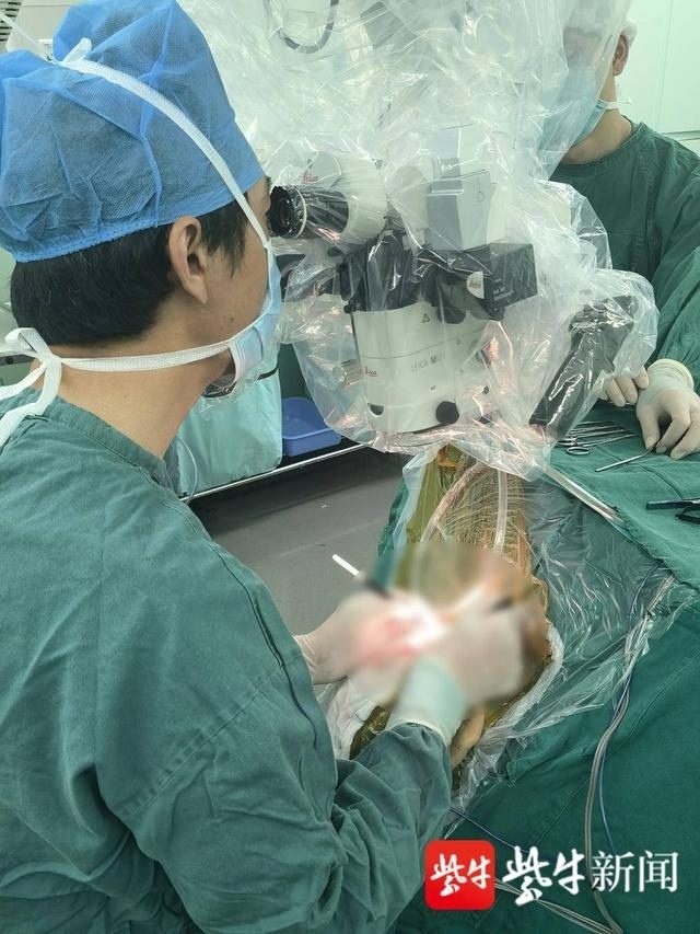 吴伟主任医师在高倍显微镜下为周女士游离头皮瓣行血管吻合