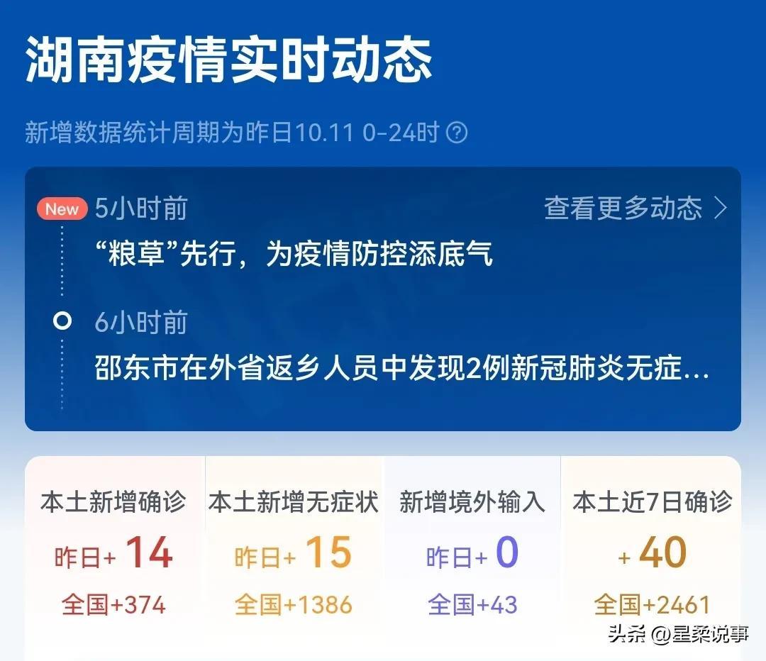 根据湖南卫健委最新消息可知,2022年10月11日0-24时新增“14+15”例,其中新增本土确诊病例14例,新增无症状感染者15例,其中长沙5例,衡阳1例,湘西15例,张家界1例,湘潭1例,岳阳5例,郴州1例。湖南疫情一直没有遇到拐点,总保持在二十多例上下,而长沙的疫情降到新增一例后,没想到又反弹了,昨天湘西州也一下子新增到15例。