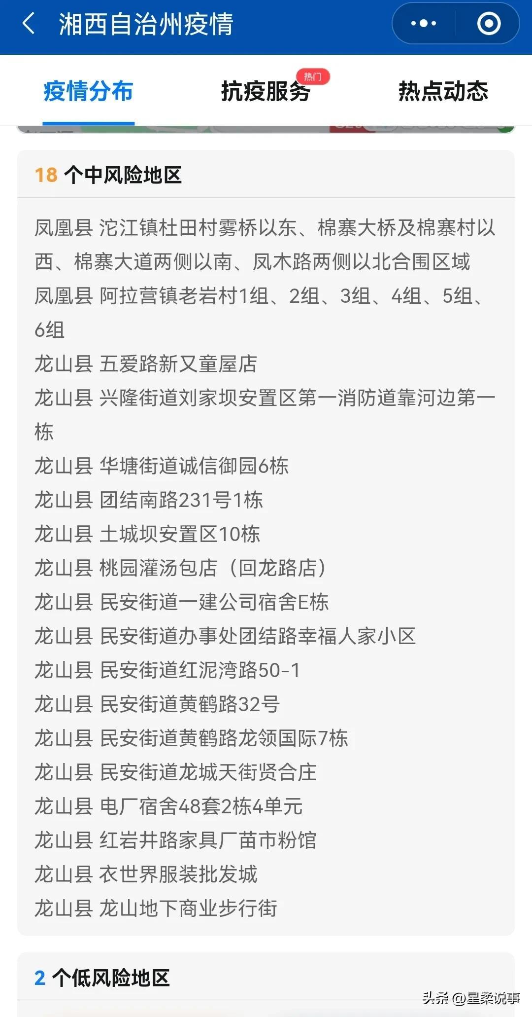 湘西州一共有20处风险地区,其中中风险地区18处,低风险地区2处,主要是龙山县和凤凰县,风险地区就不要前往了。