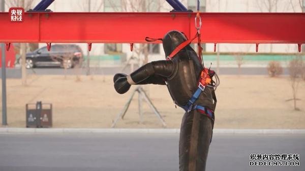 3·15晚会联合国家消防救援局,进行了安全测试。这个离地7米高的实验台,模拟高空游乐项目,消防员为身高1.7米,重量60公斤的道具假人穿戴好三点式安全带。消防员释放假人,模拟游客在吊桥上自然坠落。安全带发生严重位移,假人腰部安全带被扯到腋下,背部的安全带勒在了假人的脖颈处。