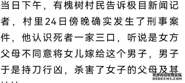 三月二十四日下午,湖南浏阳市澄谭江镇槐树村发生了一件令人心惊胆战的刑事案件。一位男子疑似因感情纠纷杀害了女方的父母和妹妹,三人经过紧急抢救后不幸去世。目前,凶手已经被抓获,但是对于案件的具体原因,仍然需要进一步的调查和核实。