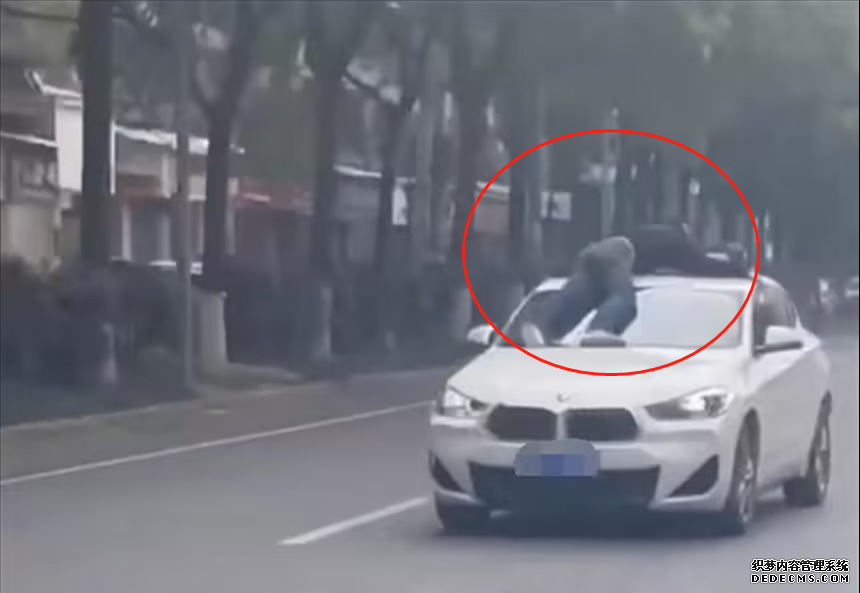 3月28日上午,湖南岳阳一名男子趴在快速行驶的宝马车车顶,长达数分钟。