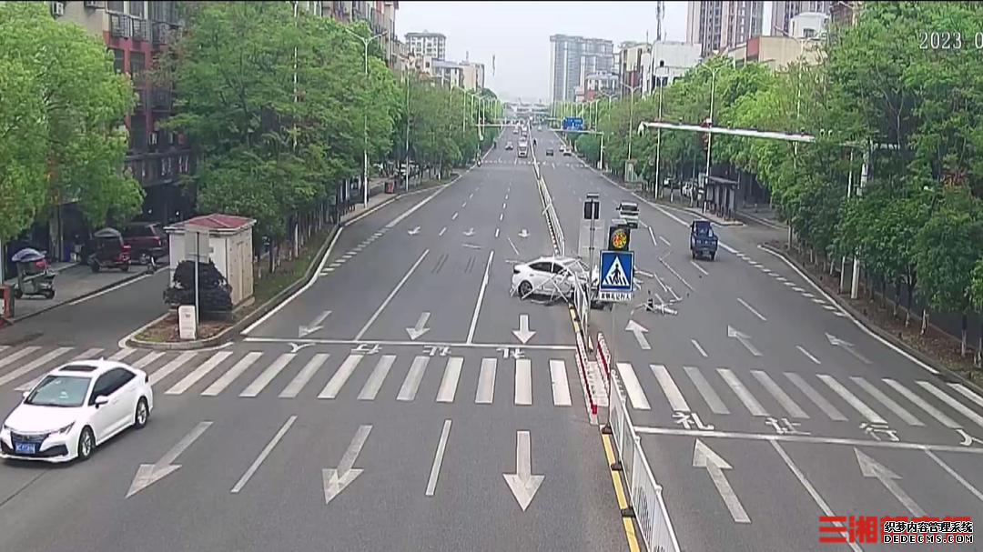 4月10日10时30分,湘潭县易俗河镇海棠路上,公共场所视频显示,行驶在内侧车道的一辆白色小车方向突然向左偏离,径直撞破中央隔离护栏冲入对向车道,占据了一个车道。小车猛烈撞击下,中央护栏部件被撞得四处飞散,所幸一辆经过的面包车刹车及时,才没有被殃及。