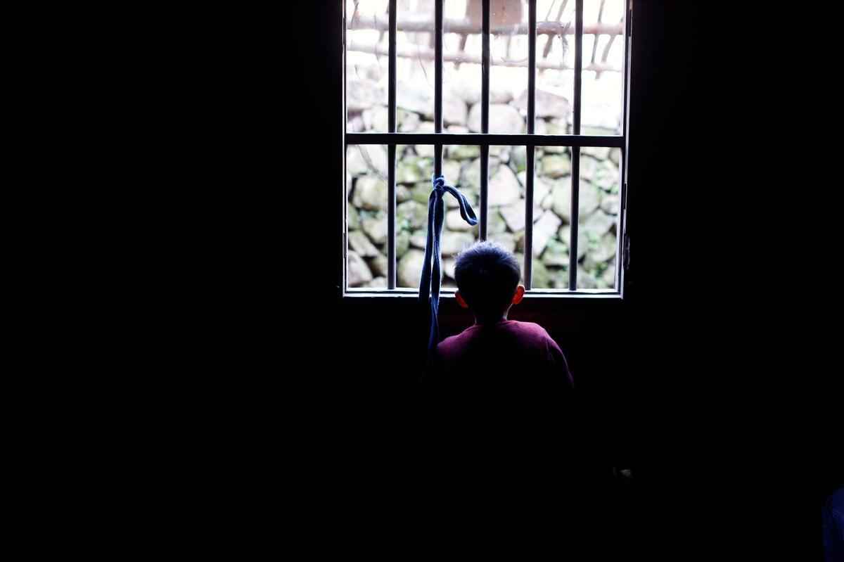 2016年3月28日,福建永春县达埔镇乌石村,解开绳索,76岁奶奶将10岁的孙女小琴搂在怀中。小琴3岁时母亲离家出走,父亲外出谋生,奶奶只能把她和哥哥小义长期关在屋内,以致兄妹俩至今都无法说话,成为“失语者”。