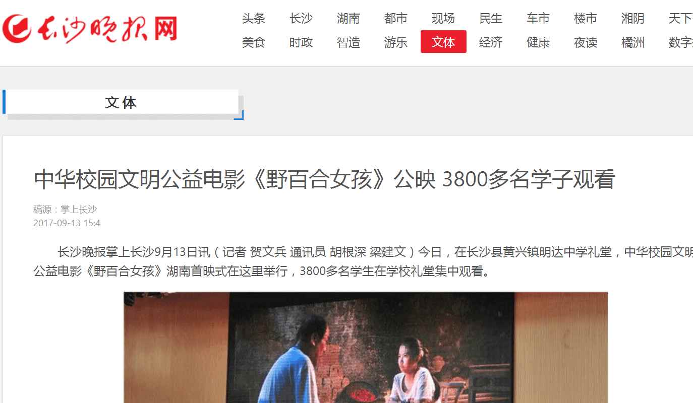 2017年9月13日,由湖南省安全教育中心承办,在湖南省长沙市明达中学举行的中华校园文明公益电影《野百合女孩》湖南首映式暨“美德进课堂·安全伴我行·爱心满校园”大型公益活动启动。国内众多媒体大篇报道。