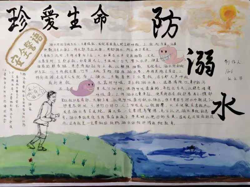 各班主题班会,以身边惨痛的案例为切入点,以预防学生溺水为重点,通过安全视频宣讲防溺水知识,进行预防溺水的知识普及教育。同学们还就自己亲身经历及所闻所见进行了讨论,从而增强对防溺水重要性的认识。举办防溺水黑板报、手抄报、书法、绘画评比,营造整体教育氛围。提高学生的防范意识和自我保护能力。