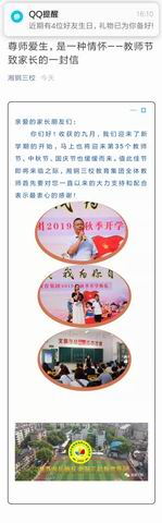 在教师节来临之际,宾咏芝校长首先给老师们送上了一份温馨的祝福信。她坚信:教育是一种情怀,尊师、爱生也是一种情怀。在当前尊师重教的良好社会氛围下,杜绝学生和家长送礼之风,树立健康文明、廉洁从教的风气,让教师度过一个健康、朴素、节俭的教师节。同时她还对学生进行感恩和廉洁教育,鼓励学生自己制作手工小礼物贺卡、手抄报、写短信祝福语,表达对老师最诚挚的祝福。