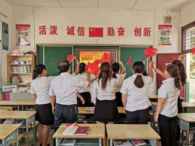 主题教育三:党员唱红歌签名写祝福语表爱国心9月30日上午,在飘扬的五星红旗下,由张颖同志领颂,全体党员、教师齐唱《歌唱祖国》拉开了唱红歌活动的序幕,随后每位党员纷纷献唱,《东方红》、《打靶归来》、《我和我的祖国》……一曲曲红歌,唱出了党员同志们对祖国的无限热爱。