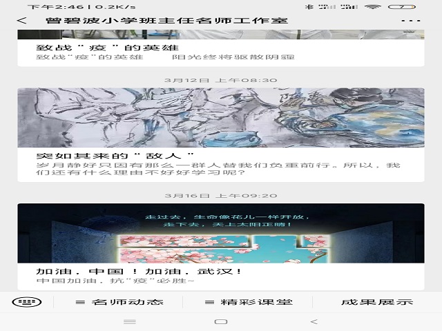 曾碧波班主任名师工作室树立“大生活”观,工作室以生活为链接,以疫情为素材,工作室成员鼓励学生用作文、手抄报、绘画特色作业,用多种形式表达出对抗击疫情第一线的医护人员、工作人员以及坚守在各自岗位上所有人的尊敬和感激,让教育绽放光彩。几位年轻教师则编辑整理“战疫”写作、视频、手抄报等素材资料,分期在工作室公众号分享,点赞率极高,师生对资源实用性非常认可。
