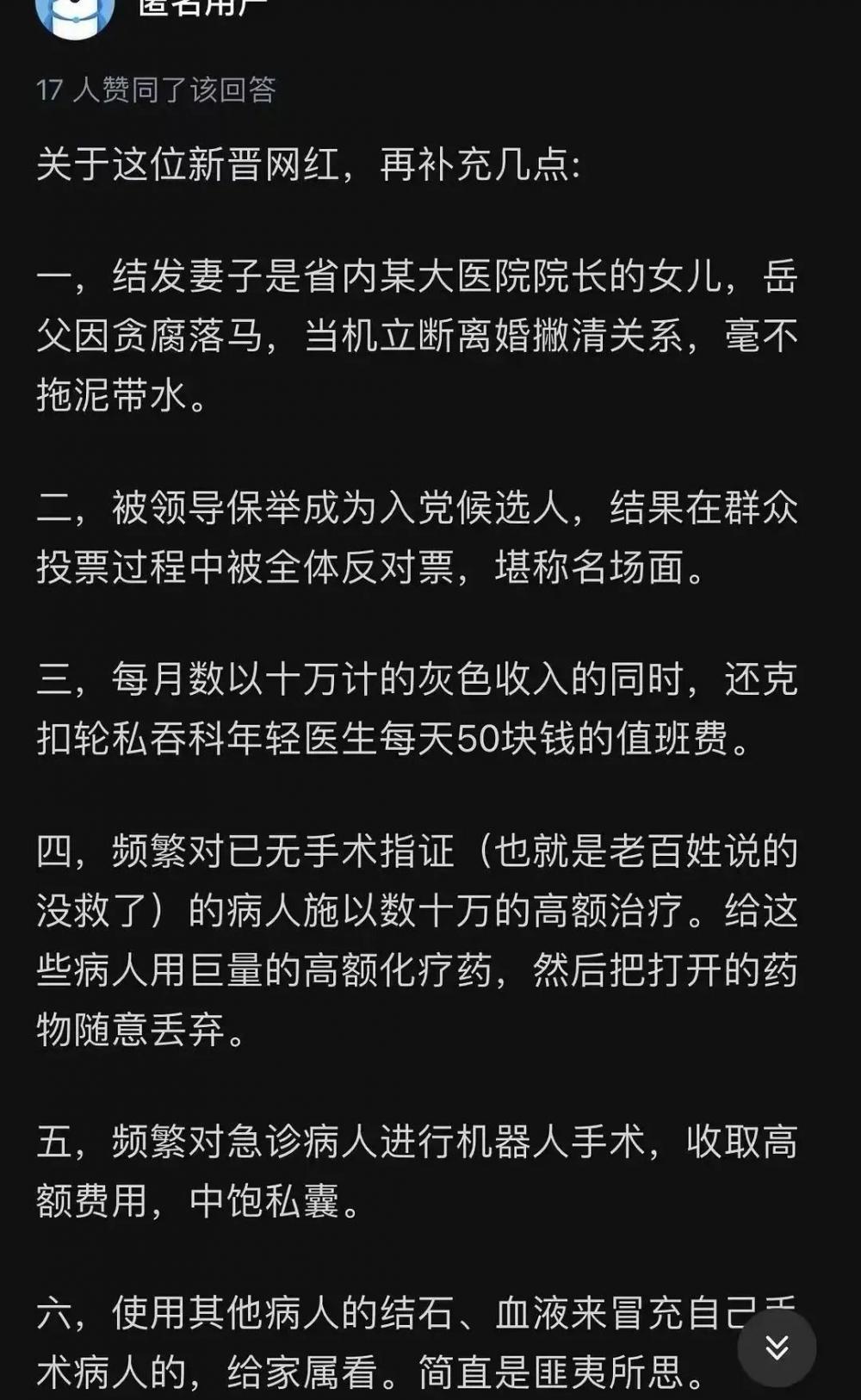 8月17日,有网友反映湖南省长沙市中南大学湘雅二医院一医生医疗作风有问题。比如,机器人做不完全性肠梗阻,开进去找不到梗阻段,就把正常肠管切下来给家属看;只要找他看病,稍微有点异物倾向,先做化疗等,引起广泛关注。