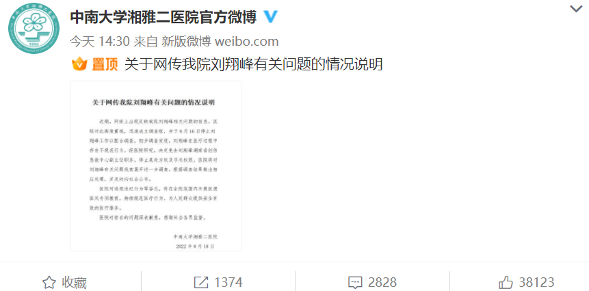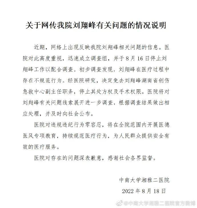 8月18日,中南大学湘雅二医院发布情况说明称:初步调查发现,刘翔峰在医疗过程中存在不规范行为。经医院研究,决定免去刘翔峰湖南省创伤急救中心副主任职务,停止其处方权及手术权限。