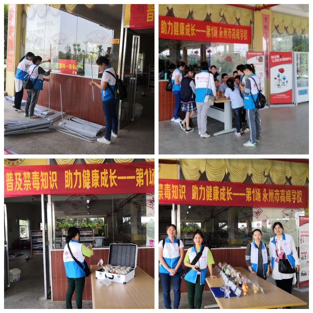 下午3点,义工们来到市高峰学校,布置宣传展板,展示毒品模型,永州市公安局冷水滩分局禁毒大队眭桂顺老师作《珍爱生命 远离毒品》的禁毒知识讲座,制作了图文并茂的PPT课件,从五个方面向学生们宣讲禁毒知识,认识毒品、毒品的危害、导致吸毒的原因、如何抵制毒品、依法禁毒,讲得通俗易懂,深受学生们欢迎。
