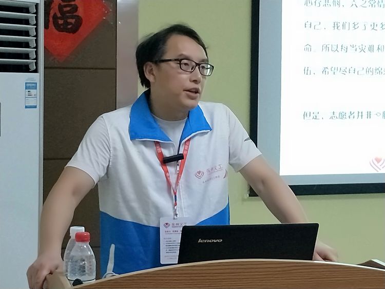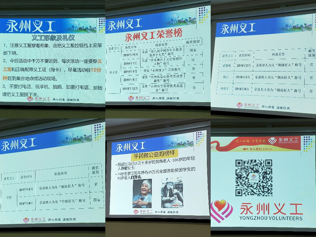 市义工协会副会长李嘉制作了文、图、视频相结合的PPT课件,从国际、国内义工(志愿者)发展史,到永州市义工协会十年发展历程,娓娓道来,课程由浅入深,通俗易懂,展现了永州义工活动的内容与先进典型人物和感人的事例。