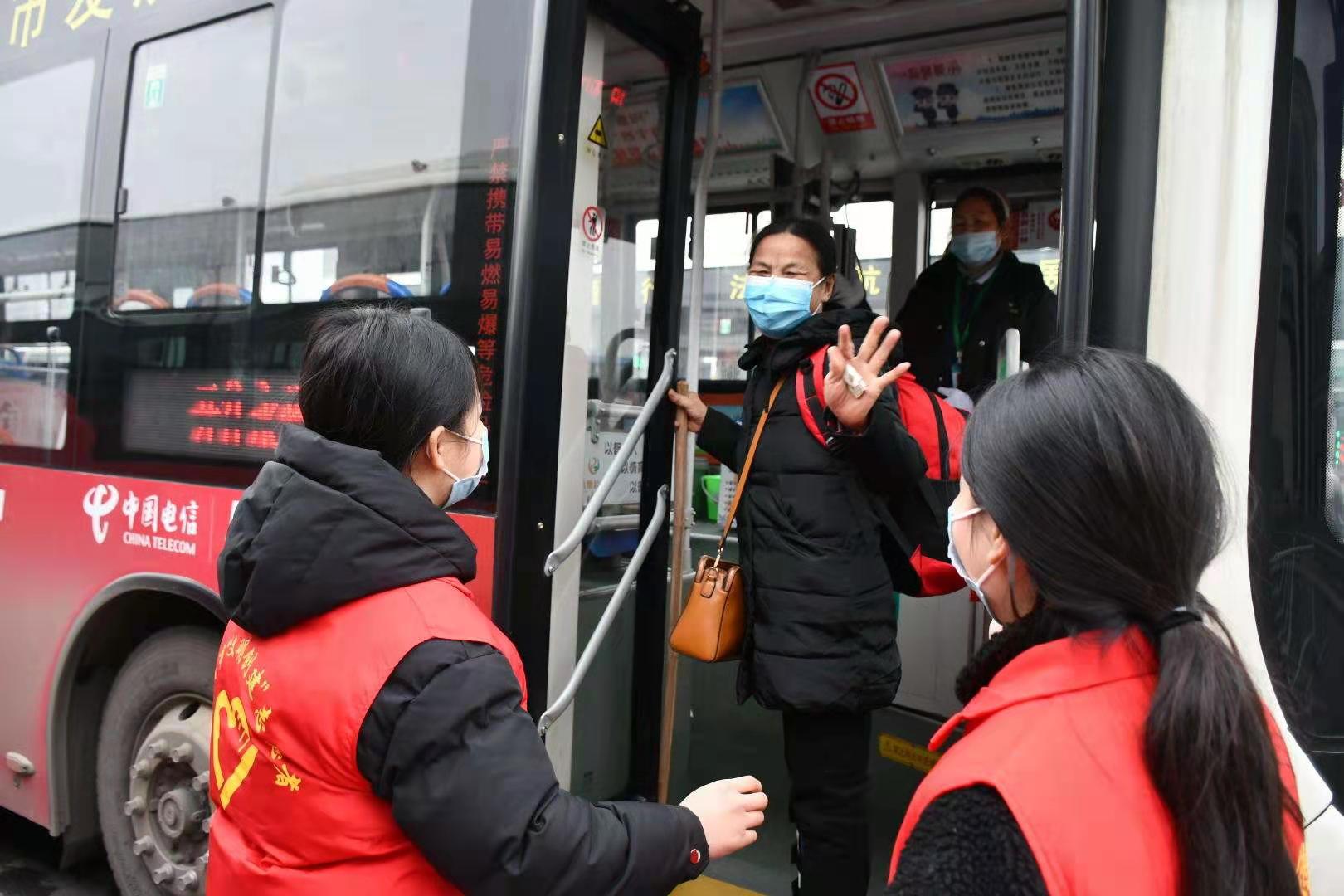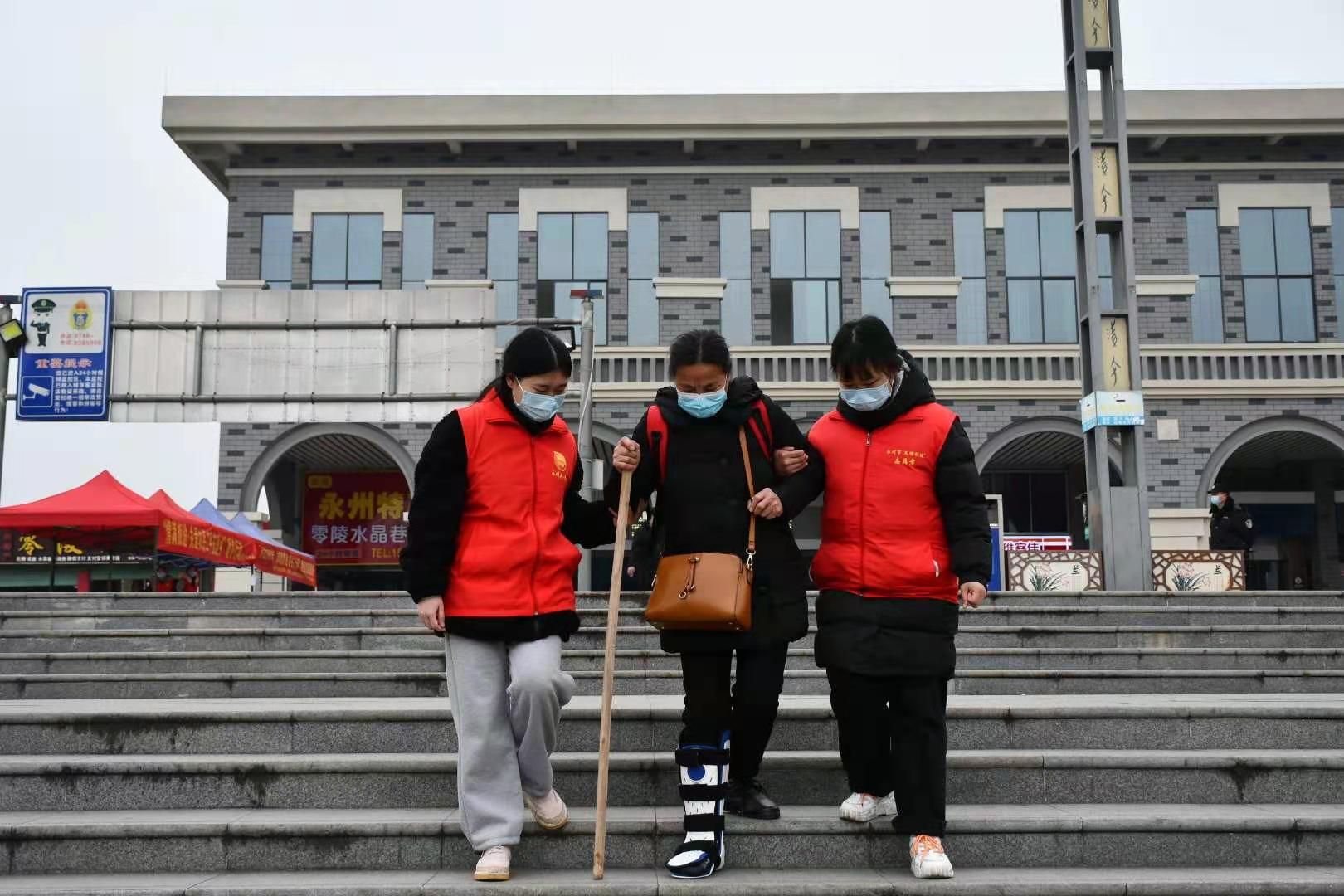 1月30日,下午,一位腿受伤打石膏的阿姨独自一人坐火车从衡阳返回永州,在出站口参加“情满旅途 暖冬行动”的两位志愿者见状立马上前搀扶护送她到公交停车场,阿姨看到志愿者热情帮助非常高兴,连连夸奖并特意拿手机跟志愿者拍照合影发朋友圈,在公交车上开心的挥手跟志愿者道别。