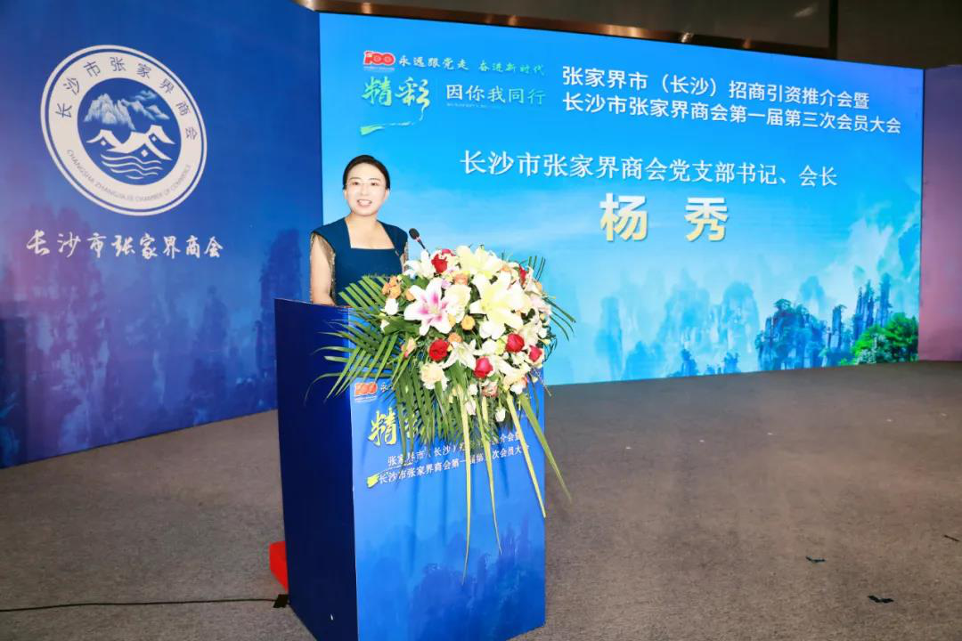 长沙市张家界商会党支部书记、会长杨秀首先代表长沙市张家界商会对出席会议的领导、嘉宾及全体会员表示热烈的欢迎并致以诚挚问候。潭水深千尺,友情依依。岩石坚不移,恩情切切,长沙市张家界商会2019年6月成立至今,从当初的120人发展到现在在联乡亲几千人,商会会员单位涵盖教育咨询、电器机电、电子信息、土木建设、机械工业、建材装饰、商贸餐饮、法律服务、文化传媒等众多领域,拥有固定资产约50多亿元,安置就业人员5万余人,年产值营业额达到120多亿元,为长沙和张家界两地经济发展提供了巨大的发展潜力。并表示愿与社会各界精诚合作,通过资源共享,信息互通,与市委、市政府同心同向同力,团结和引导广大会员,在立足岗位建功立业的同时积极建言资政,自觉担当推动“十四五”规划实施的时代使命,在助力“三高四新”战略、坚持“对标提质、旅游强市”和11567总体思路,在家乡打造“两地两区一龙头一家园”进程中,凝心聚力发挥商会优势,助力家乡经济社会高质量发展,以优异成绩庆祝中国共产党成立100周年。
