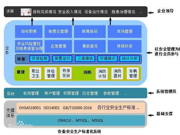 2)业务层,是该系统的核心,以安全管理者为核心全员参与,业务功能以安全生产标准化为基础,包括目标、组织结构和职责、安全生产投入、法律法规和安全制度、教育培训、生产设备设施、作业安全、应急救援、隐患排查与治理、重大危险源、职业健康、事故管理、绩效评定和改进等。
