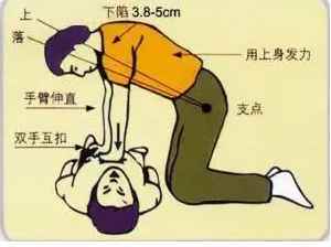 将溺水者救上岸后,如发现溺水者的心跳已停或极其微弱,则应立即施行胸外心脏按摩,通过间接挤压心脏使其收缩与舒张,恢复泵血功能。胸外心脏按摩与人工呼吸的配合施行,是对尚未出现真死现象的溺水者之生命做最后挽救,使其恢复自主心跳与呼吸的重要手段。胸外心脏按摩的具体做法是:将溺水者仰卧平放地上,救生者骑跪在溺水者大腿两侧或跪在其身旁,两手掌相叠,掌根按在溺水者胸骨下端(对儿童,只需用一个手掌;对婴幼儿,只需三个手指),两臂伸直,身体前倾,借助身体的重量稳健地下压,压力集中在掌根,使溺水者胸骨下陷约3—4厘米。然后,上体复原,迅速放松双手,但掌根不离位。如此有节奏地进行,每分钟约60—80次。下压时用力要均匀,不宜用力过猛,松手要快(见下图)。胸外心脏按摩也需要耐心和毅力,有时也要经过数小时的不懈努力才能使溺水者起死回生。胸外心脏按摩与口对口人工呼吸结合运用的方法是,如有两人配合施救,则一人做胸外心脏按摩,另一人做口对口人工呼吸;如只有一人施救,则是吹一口气后,做5—8次心脏按压,然后再吹气。