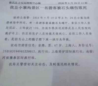 据悉,4月19日,小寨沟景点安全员接到通知,一名游客()在小寨沟回路凉亭往下的台阶处,被一块猴子蹬掉的石头砸中脑部。景区立即拨打120,由景区医护人员进行简单包扎后,小寨沟管理所所长薛杰等人协助急救人员,将游客送至修武县人民医院抢救,经诊断不治身亡。导游已通知其家属。下一步,景区将就相关善后事宜与家属进行磋商。