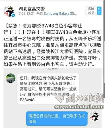 暖!宜昌村民被毒蛇咬伤 交警抢开生命通道(图