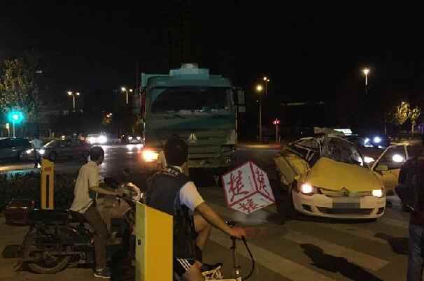 目击者刘先生介绍,7月22日凌晨2时30分许,他开车路过二七路,看到路口一辆渣土车和的士撞在一起,停车下来看到,渣土车拦腰撞在的士右侧车身,副驾驶座上的乘客被卡住,不停的呼喊救命,司机双手撑着车窗,尚有意识,但没有说话。