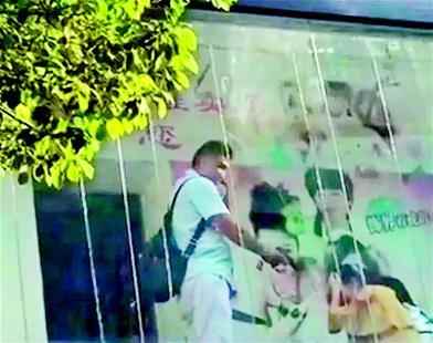 图为:透过橱窗可以看见男子用“枪”指着女人质