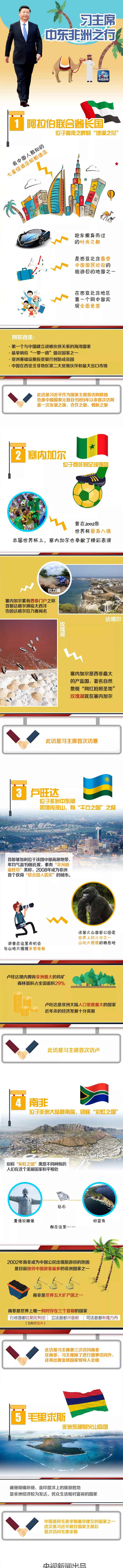 7月19日至28日,习近平主席将对阿联酋、塞内加尔、卢旺达和南非进行国事访问,出席在南非约翰内斯堡举行的金砖国家领导人第十次会晤,过境毛里求斯并进行友好访问。你对这几个国家知道多少?一图了解!